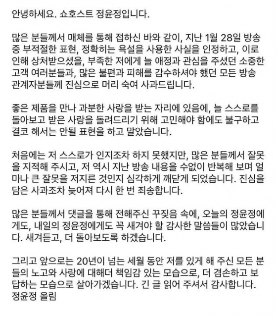 정윤정은 "좋은 제품을 만나 과분한 사랑을 받는 자리에 있음에, 늘 스스로를 돌아보고 받은 사랑을 돌려드리기 위해 고민해야 함에도 불구하고 결코 해서는 안 될 표현을 하고 말았다"라며 "처음에는 스스로 인지조차 하지 못했지만 많은 분들께서 잘못을 지적해주시고 나 역시 지난 방송 내용을 수없이 반복해 보며 얼마나 큰 잘못을 저지른 것인지 심각하게 깨닫게 됐다. 진심을 담은 사과조차 늦어져 다시 한 번 죄송하다"라고 전했다.