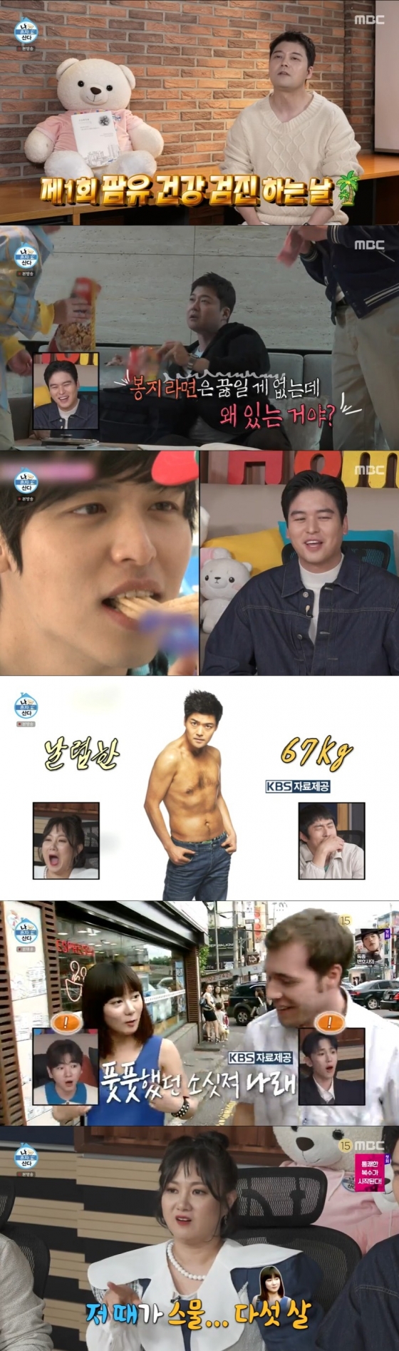 박나래는 건강검진표 작성 중 배고픔을 호소하는 이장우에게 냉장고급 간식 상자를 공개했다. 박나래는 조미김, 봉지 라면, 즉석밥 등 다양한 간식을 꺼내 웃음을 자아냈다.