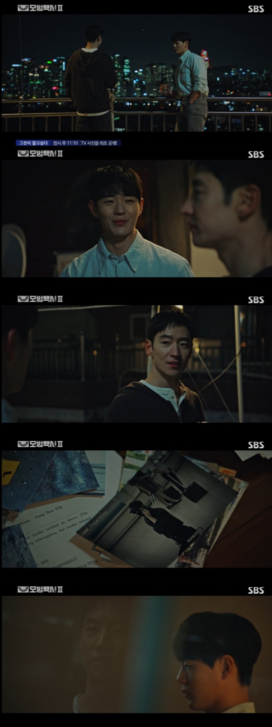 18일 오후 방송된 SBS 금토드라마 '모범택시 2'에서는 온하준(신재하 분)과 김도기(이제훈 분)가 김도기의 옥탑방 집에서 대화를 나누는 장면이 그려졌다.