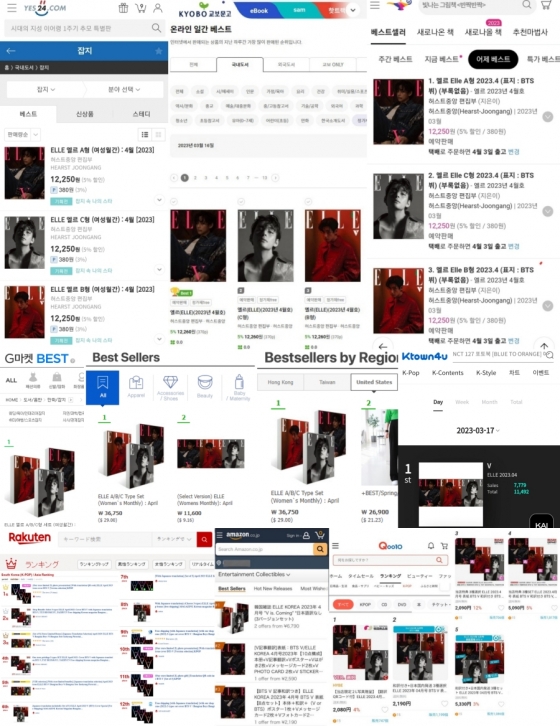 뷔가 표지로 등장한 패션 매거진 '엘르' 4월호는 지난 16일 뷔의 3종 커버사진이 공개 후 알라딘, 예스24, 교보문고, 지마켓 온라인 판매사이트에서 모두 베스트셀러 1위에 올랐다.
