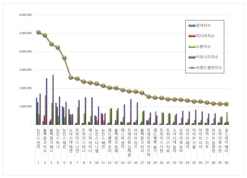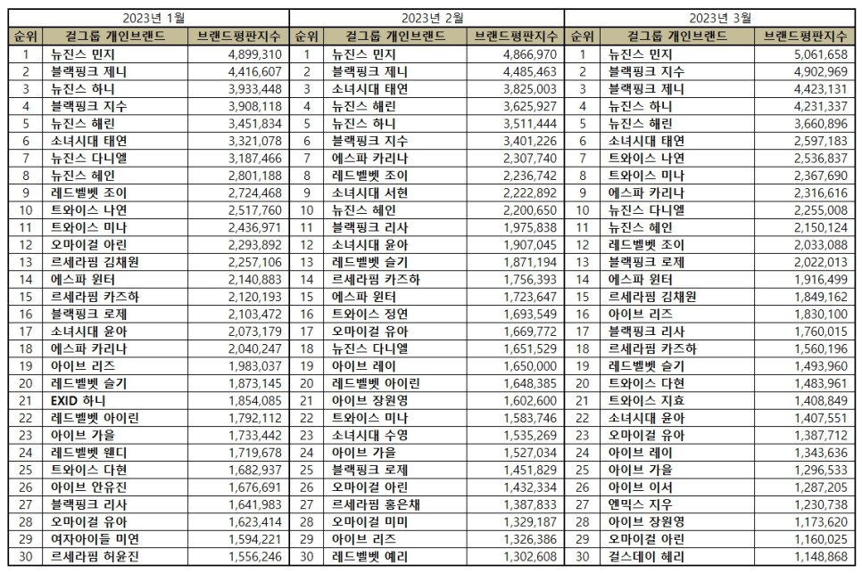 2023년 3월 걸그룹 개인 브랜드평판 30위 순위는 뉴진스 민지, 블랙핑크 지수, 블랙핑크 제니, 뉴진스 하니, 뉴진스 해린, 소녀시대 태연, 트와이스 나연, 트와이스 미나, 에스파 카리나, 뉴진스 다니엘, 뉴진스 혜인, 레드벨벳 조이, 블랙핑크 로제, 에스파 윈터, 르세라핌 김채원, 아이브 리즈, 블랙핑크 리사, 르세라핌 카즈하, 레드벨벳 슬기, 트와이스 다현, 트와이스 지효, 소녀시대 윤아, 오마이걸 유아, 아이브 레이, 아이브 가을, 아이브 이서, 엔믹스 지우, 아이브 장원영, 오마이걸 아린, 걸스데이 혜리 순으로 분석됐다.
