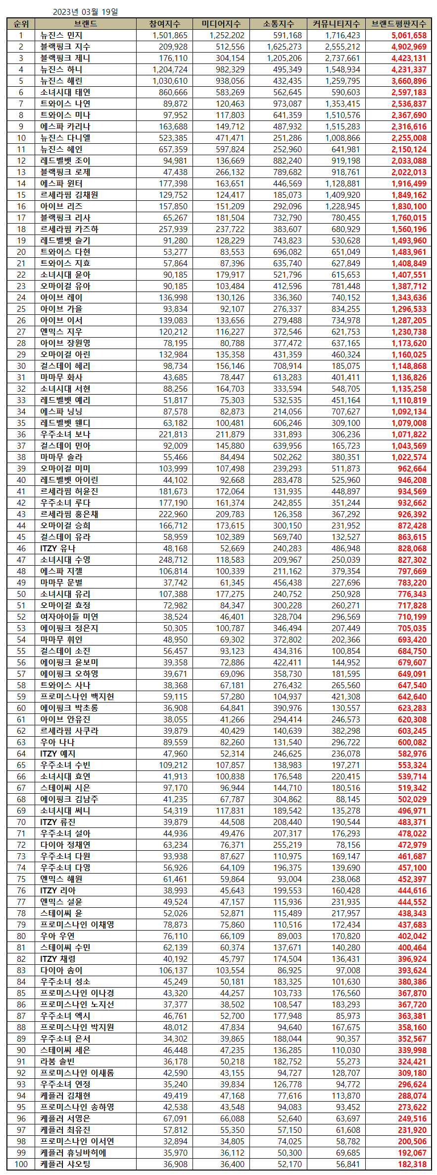 2023년 3월 걸그룹 개인 브랜드평판 100위 브랜드는 뉴진스 민지, 블랙핑크 지수, 블랙핑크 제니, 뉴진스 하니, 뉴진스 해린, 소녀시대 태연, 트와이스 나연, 트와이스 미나, 에스파 카리나, 뉴진스 다니엘, 뉴진스 혜인, 레드벨벳 조이, 블랙핑크 로제, 에스파 윈터, 르세라핌 김채원, 아이브 리즈, 블랙핑크 리사, 르세라핌 카즈하, 레드벨벳 슬기, 트와이스 다현, 트와이스 지효, 소녀시대 윤아, 오마이걸 유아, 아이브 레이, 아이브 가을, 아이브 이서, 엔믹스 지우, 아이브 장원영, 오마이걸 아린, 걸스데이 혜리, 마마무 화사, 소녀시대 서현, 레드벨벳 예리, 에스파 닝닝, 레드벨벳 웬디, 우주소녀 보나, 걸스데이 민아, 마마무 솔라, 오마이걸 미미, 레드벨벳 아이린, 르세라핌 허윤진, 우주소녀 루다, 르세라핌 홍은채, 오마이걸 승희, 걸스데이 유라, ITZY 유나, 소녀시대 수영, 에스파 지젤, 마마무 문별, 소녀시대 유리, 오마이걸 효정, 여자아이들 미연, 에이핑크 정은지, 마마무 휘인, 걸스데이 소진, 에이핑크 윤보미, 에이핑크 오하영, 트와이스 사나, 프로미스나인 백지헌, 에이핑크 박초롱, 아이브 안유진, 르세라핌 사쿠라, 우아 나나, ITZY 예지, 우주소녀 수빈, 소녀시대 효연, 스테이씨 시은, 에이핑크 김남주, 소녀시대 써니, ITZY 류진, 우주소녀 설아, 다이아 정채연, 우주소녀 다원, 우주소녀 다영, 엔믹스 해원, ITZY 리아, 엔믹스 설윤, 스테이씨 윤, 프로미스나인 이채영, 우아 우연, 스테이씨 수민, ITZY 채령, 다이아 솜이, 우주소녀 성소, 프로미스나인 이나경, 프로미스나인 노지선, 우주소녀 엑시, 프로미스나인 박지원, 우주소녀 은서, 스테이씨 세은, 라붐 솔빈, 프로미스나인 이새롬, 우주소녀 연정, 케플러 김채현, 프로미스나인 송하영, 케플러 서영은, 케플러 최유진, 프로미스나인 이서연, 케플러 휴닝바히에, 케플러 샤오팅 순으로 분석됐다.