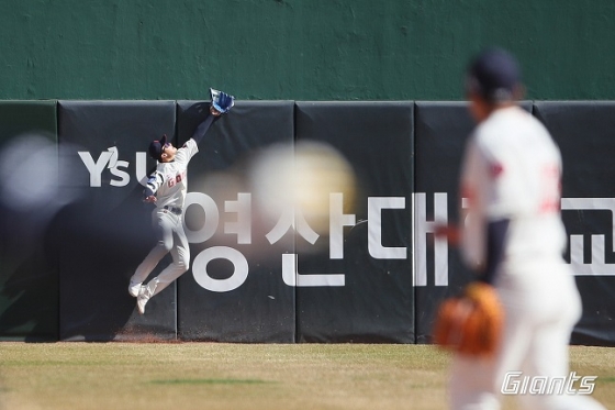 하지만 윤동희의 송구는 2루수 안치홍이 겨우 점프해 잡을 정도로 높게 갔다. 그 사이 송찬의는 3루까지 안착했다. 추가 실점으로 이어지지는 않았지만 아찔한 순간이었다.