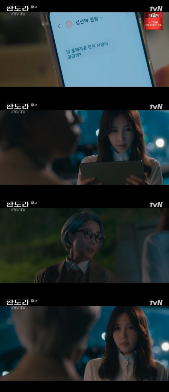 19일 방송된 tvN 토일드라마 '판도라 : 조작된 낙원'(이하 '판도라')에서는 홍태라(이지아 분)가 김선덕(심소영 분)이 보낸 '널 홍태라로 만든 사람이 궁금하냐'라는 문자를 받는 장면이 그려졌다.