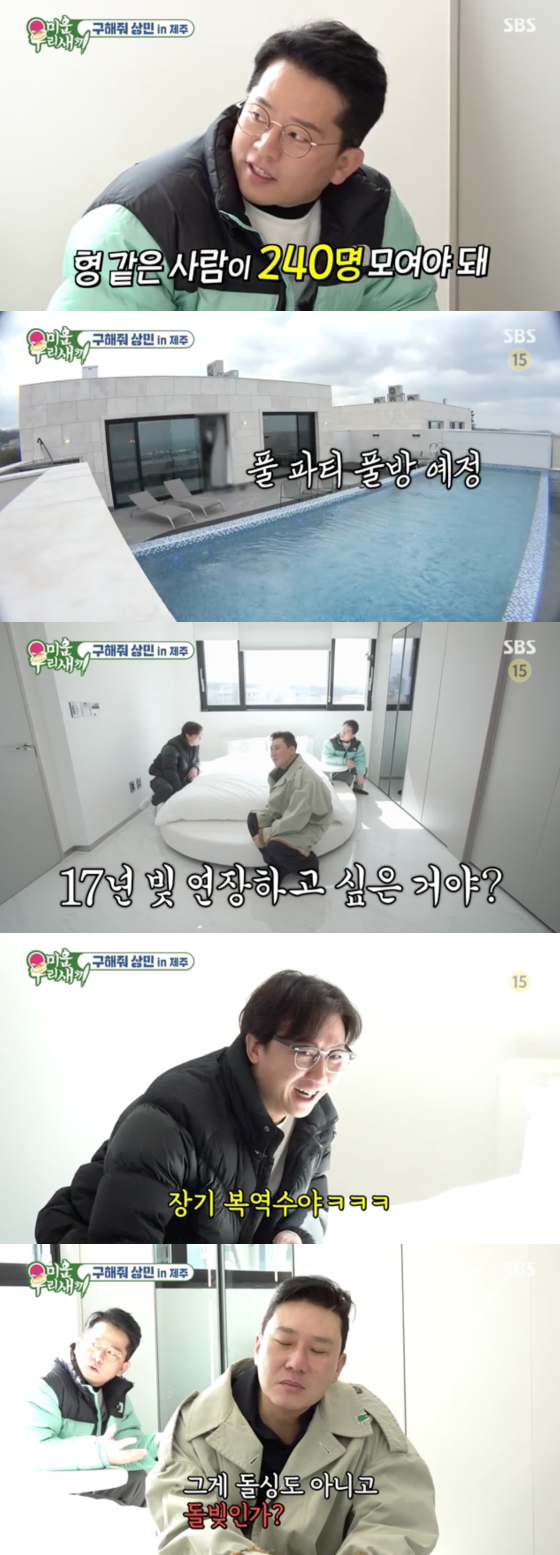 이상민은 올해 하반기에 17년 간 갚아온 빚을 모두 청산할 예정이라 밝혀 환호를 받았다. 이상민은 다음 집은 제주도에서 구하겠다며 탁재훈과 김준호에 대저택을 소개했고, 두 사람은 널찍한 방에 이어 인피니티 풀까지 공개되자 환호를 금치 못했다.