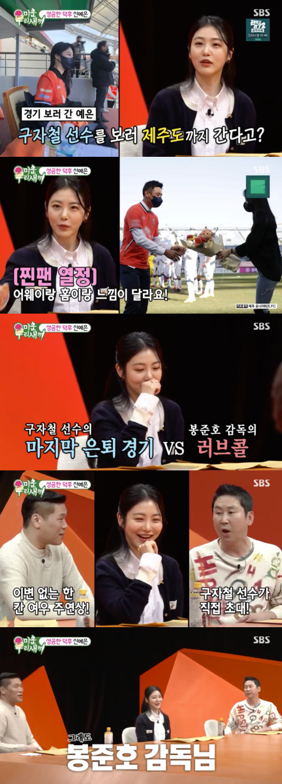 신예은은 이날 " K-리그 제주 유나이티드 구자철 선수의 엄청 오래된 팬이다. 중학교 1학년부터 좋아했다. 아시아컵을 우연히 보다 반했다"고 밝혀 놀라움을 안겼다. 신동엽은 이에 "구자철 선수의 마지막 은퇴 경기가 있는 날 봉준호 감독이 다음 작품을 함께 하자고 했다면?"이라 짓궂은 질문을 던졌다.