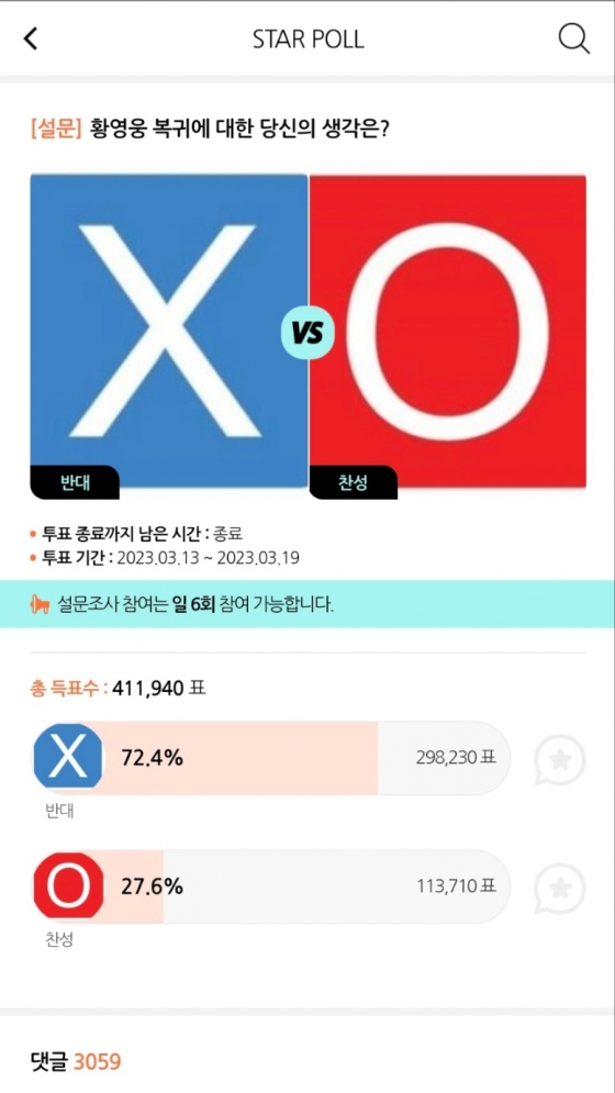 20일 모바일 아티스트 종합 콘텐츠 앱 스타폴(STARPOLL)이 '황영웅 복귀에 대한 당신의 생각은?'이라는 주제로 설문 조사를 진행한 결과, 반대하는 의견이 29만 8230표로 72.4%를 차지했다. 황영웅의 활동 재개에 대해 절반 이상이 반대표를 던진 것.