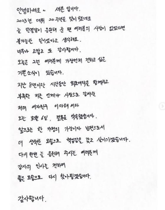 그는 "다가오는 5월, 저희가 오래된 연인에서 이젠 부부가 되기로 약속하였답니다"라고 세븐과 결혼 소식을 알렸다.
