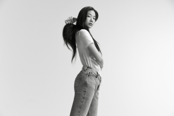 카즈라는 연한 블루 쉐이드 컬러의 90년대 스트레이트 진으로 쿨한 룩을 연출했으며, 하이 웨이스트와 크롭 컷의 하이 크롭 와이드 레그 진을 통해 역동적인 실루엣을 완성했다.
