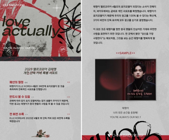 엘르 코리아가 뷔가 커버를 장식한다고 발표하자 곧바로 바이두뷔바는 "태형아 너의 모든 순간을 응원해"라는 문구와 함께 엘르 코리아 3버전 모두에 광고를 진행한다고 밝혔다.