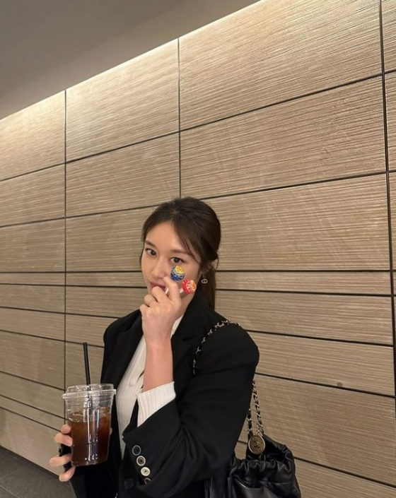 사진 속 지연은 커피와 막대사탕을 든 채 카메라를 응시하고 있다. 결혼 후 더 예뻐진 인형같은 외모가 눈길을 끈다.