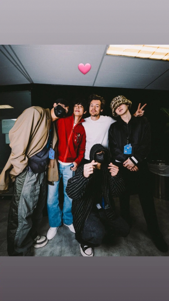 뷔 또한 해리 스타일스의 인스타그램 계정을 태그하며 같은 사진을 공개해 눈길을 끌었다. 세계적으로 큰 사랑을 받고 있는 다섯 사람의 모습이 훈훈함을 안긴다.