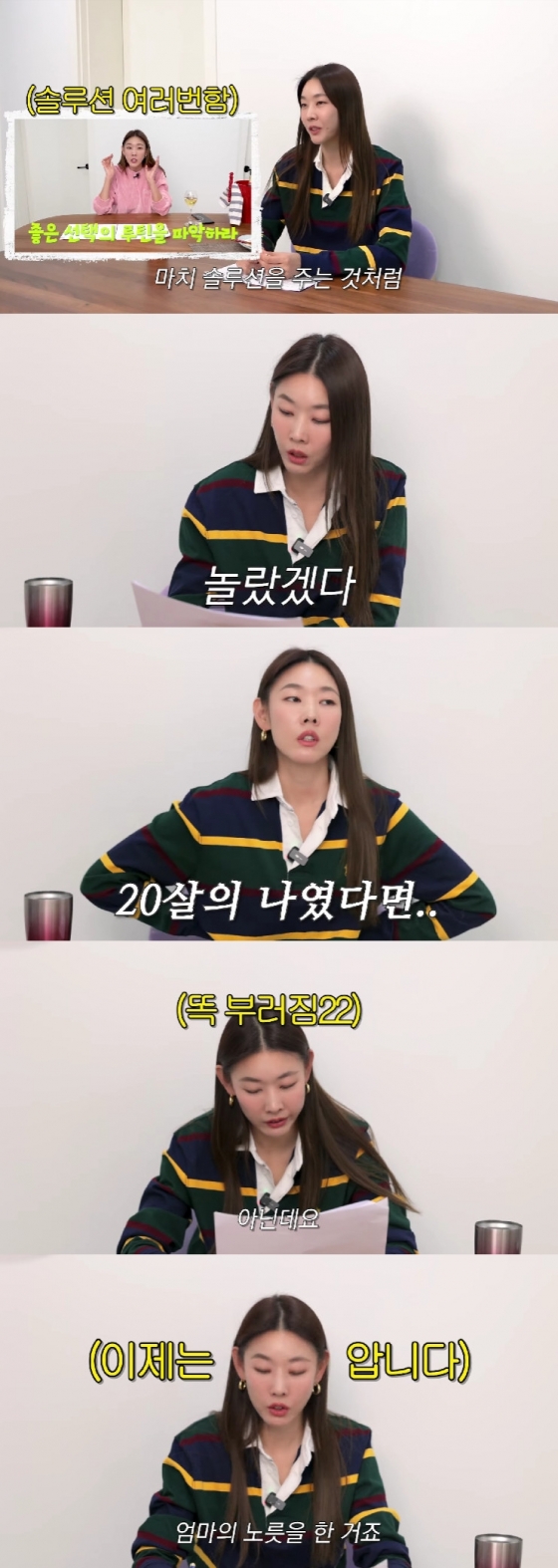 부모님의 이혼 후 엄마의 연애를 시작하고 있다는 사실을 알게 된 구독자에게 한혜진은 "20살의 나였다면 당황할 것 같기는 하다. 사춘기를 지나고 갓 성인이 됐으니까 경험치가 적기 때문에 남의 인생도 이해하기 어렵다. 산전수전을 겪다 보면 남의 산전수전도 이해하게 된다"고 말했다.