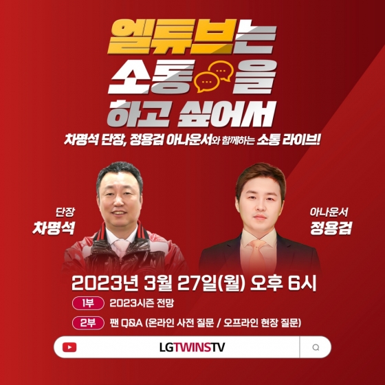 이번 라이브 방송에는 차명석 단장과 함께 정용검 아나운서가 출연해 진행을 맡는다. 또 라이브 현장에 2023년 팬 자문단을 초청한다.