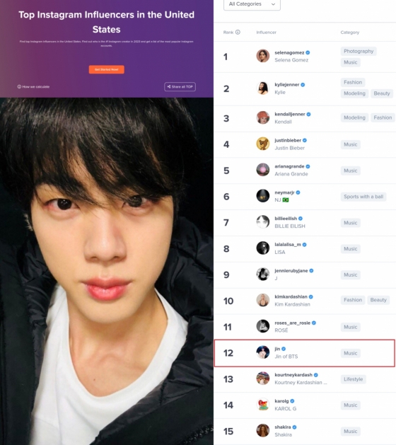 방탄소년단 멤버 중에서 '미국에서 가장 영향력 있는 인플루언서' TOP 50에 랭크인한 유일한 멤버인 진은 최유명 아티스트이자 셀럽인 빌리 아일리시, 샤키라 등과 함께 최정상의 인기를 과시했다.