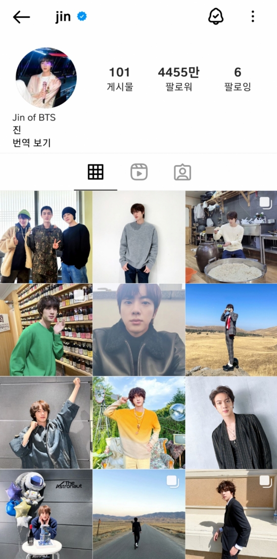 '보컬킹'이라고 불리며 전문가들의 찬사를 받는 뛰어난 보컬 실력과 음악성, '세계 미남 1위'로 선정되는 등 완벽하다는 극찬을 듣는 미모와 훤칠한 황금 비율 피지컬, 소탈하며 다정한 성품이 엿보이는 일상과 타고난 유머 감각이 담긴 글로벌 슈퍼 스타 진의 인스타그램은 개설 즉시 압도적인 사랑을 받고 있다. 진의 인스타그램은 지난해 12월 육군 현역 입대로 인해 게시물 업로드가 거의 없음에도 불구하고 계속 증가하며 3월 23일 오전 현재 4455만 팔로워를 기록 중이다.