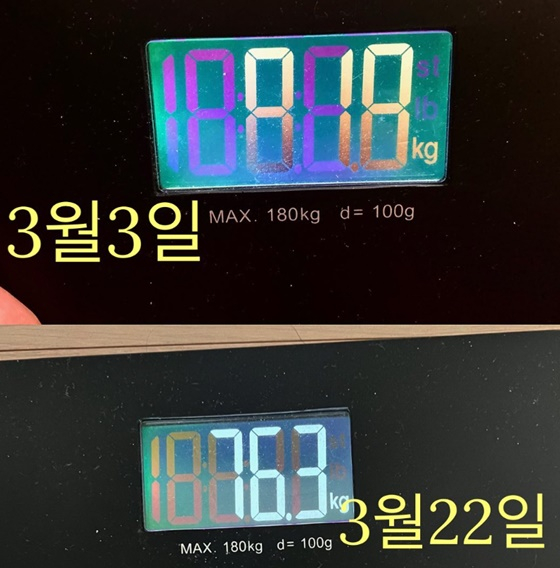 공개된 사진에는 김형준의 몸무게가 찍힌 체중계 모습이 담겼다. 이에 따르면 지난 3일 김형준의 체중은 81.8kg였으나 22일 76.3kg로 줄어들었다.