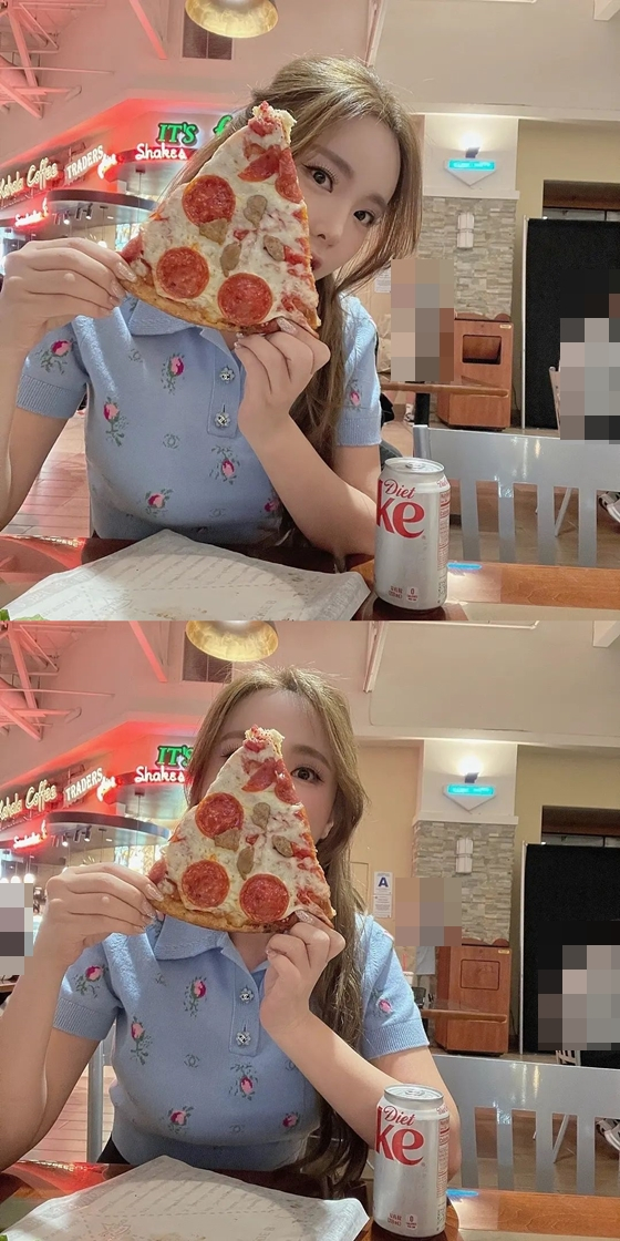공개된 사진에는 홍진영이 피자로 얼굴 가린 모습이 담겼다. 피자를 들고 장난기 가득한 모습을 보여 팬들의 시선을 사로잡았다.