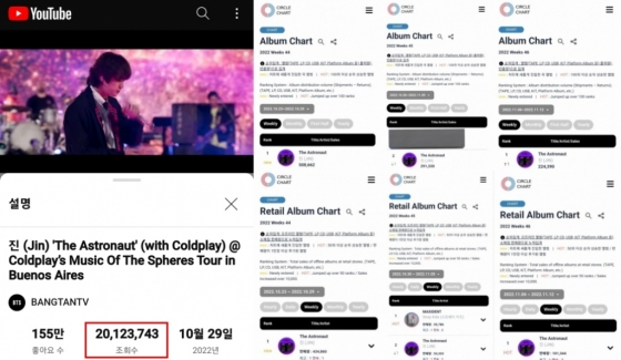 진이 아르헨티나에서 개최된 콜드플레이 월드 투어 공연에 스페셜 게스트로 참여해 라이브 무대를 처음으로 선보인 'The Astronaut' (with Coldplay) @ Coldplay's Music Of The Spheres Tour in Buenos Aires' 영상은 3월 23일 2000만 뷰를 넘어섰다.