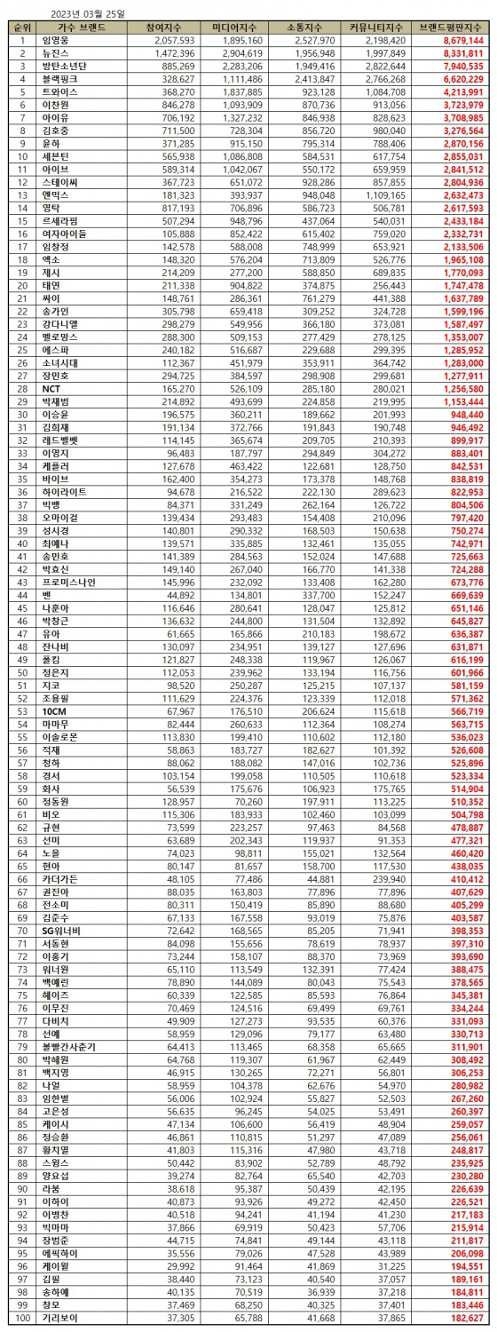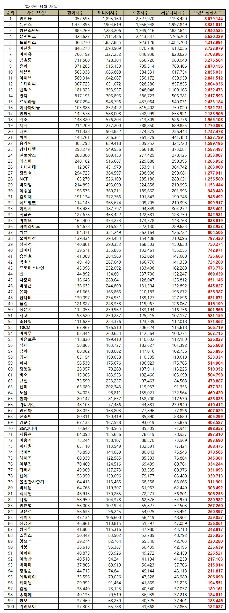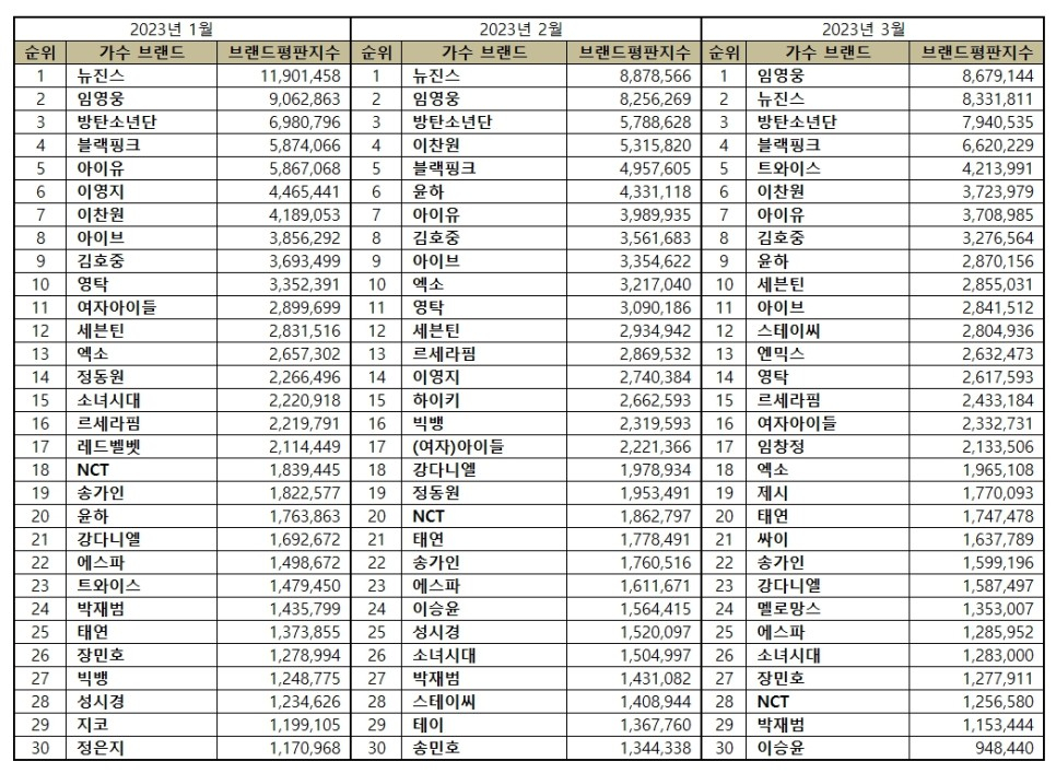 2023년 3월 가수 브랜드평판 30위 순위는 임영웅, 뉴진스, 방탄소년단, 블랙핑크, 트와이스, 이찬원, 아이유, 김호중, 윤하, 세븐틴, 아이브, 스테이씨, 엔믹스, 영탁, 르세라핌, 여자아이들, 임창정, 엑소, 제시, 태연, 싸이, 송가인, 강다니엘, 멜로망스, 에스파, 소녀시대, 장민호, NCT, 박재범, 이승윤 순으로 분석됐다.