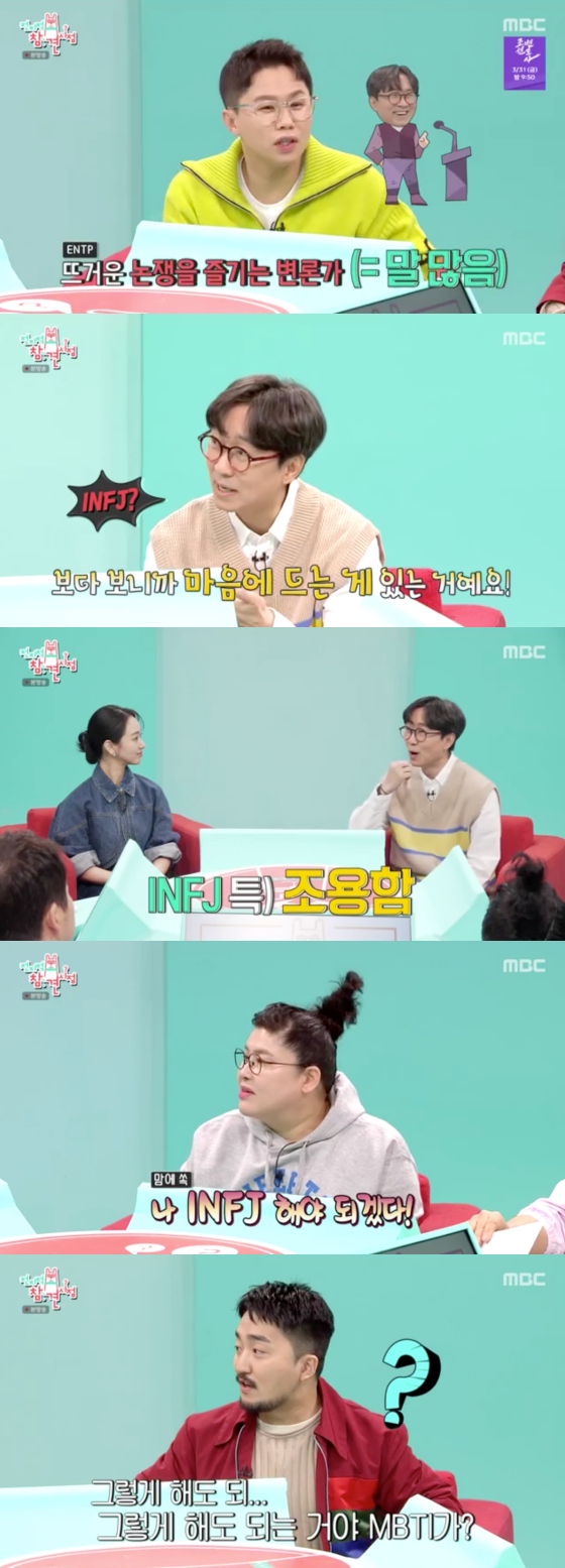 장항준은 이날 자신의 MBTI를 공개했다. 장항준은 "원래는 ENTP다. 근데 보다 보니까 마음에 드는 게 있는 거다. INFJ라고 조용한"이라 말해 의아함을 자아냈다. 그러나 이영자는 "그렇냐. 나도 INFJ 해야 되겠다"고 답해 의아함을 더했다.
