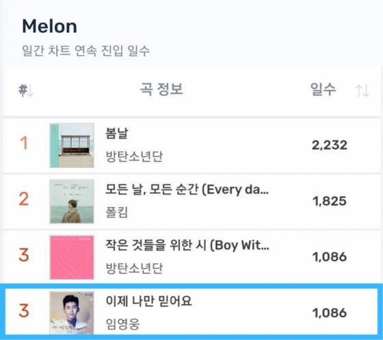 임영웅의 '이제 나만 믿어요'는 방탄소년단 '봄날' 2232일, 폴킴 '모든 날, 모든 순간' 1825일에 이어 역대 톱3 기록을 세웠다. 방탄소년단의 '작은 것들을 위한 시'가 1086일로 '이제 나만 믿어요'와 함께 3위에 랭크됐다.