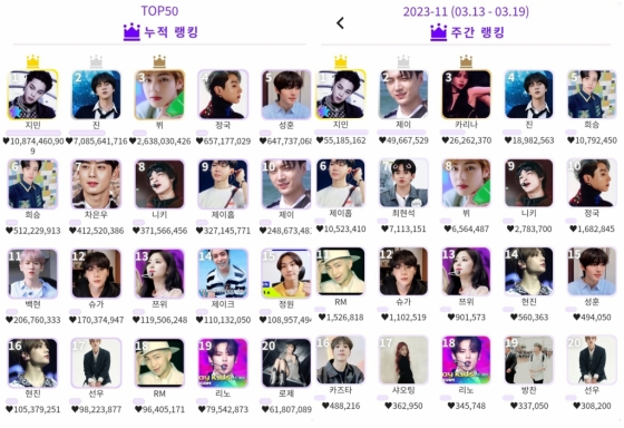 1주간 총 5518만 5162개의 하트를 받아 122주째 1위에 오른 지민은 자신이 보유한 주간랭킹 최다 1위 신기록을 자체 경신했다.