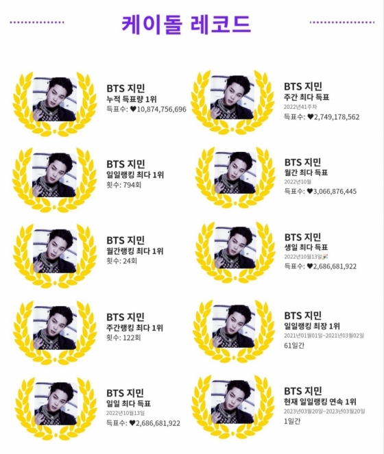 지민은 3월 21일 기준 총 108억 7475만 6696 하트의 놀라운 득표수로 '명예의 전당' 누적 득표량 1위를 유지하며 글로벌 팬들의 전폭적인 사랑과 지지를 받고 있다.