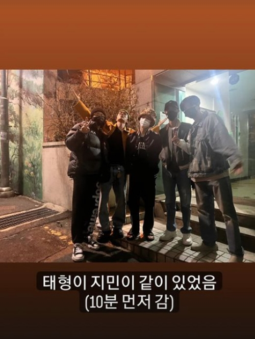 슈가는 사진에 없는 뷔(태형)과 지민도 언급했다. 그는 사진에 "태형이 지민이 같이 있었음(10분 먼저 감)"이라고 전해 모처럼 방탄소년단이 완전체로 뭉쳤음을 알렸다.