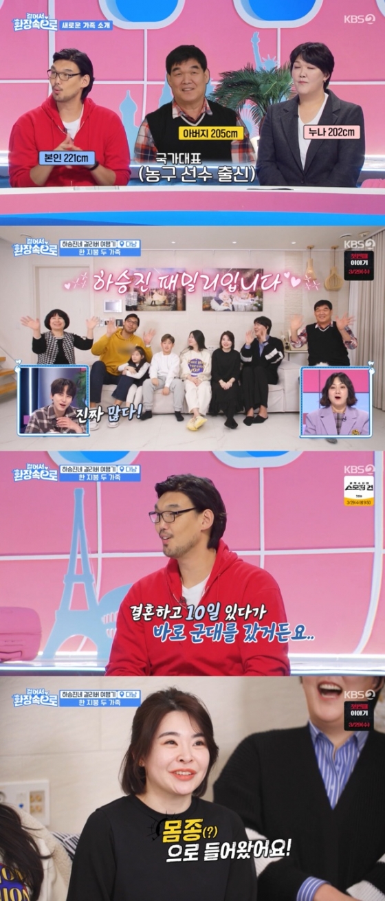 이어 하승진은 한 지붕 아래에 하승진, 아내, 아버지, 친누나, 장모님, 처제, 아들, 딸까지 총 8명의 구성원이 함께 살고 있다고 했다. 하승진의 누나 하은주는 "때는 바야흐로 두 사람의 결혼 후 기묘한 동거가 시작됐다"라고 말했다. 하승진은 "가장 결정적이었던 계기가 아내가 신혼집 뒤로하고 아버지를 모시고 살자고 했다. 고마웠다. 근데 둘 다 일을 하니 아이를 돌봐줄 사람이 필요했다. 그래서 장모님이 들어오게 됐다"라고 덧붙였다.
