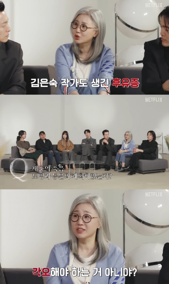 또한 "재준(박성훈 분)의 죽음이 도영과 동은의 계획이었냐"라는 질문에 "(두 사람이) 계산했다고 생각한 거다. 그전까지는 동은이었고, 옥상에서부터 추락까지는 도영이 손으로 했고, 둘이 같이 계획한 거라고 생각하며 썼다. 결국 도영이는 피해자인지, 가해자인지 생각하는 건 시청자들의 몫이다"라며 "재준이 피해자인 소희가 추락해서 죽은 것처럼 똑같이 죽길 원했다"고 설명했다.