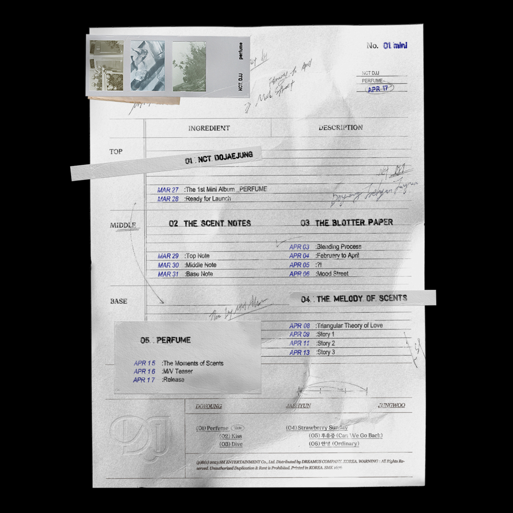 NCT 도재정 첫 미니앨범 'Perfume'은 4월 17일 오후 6시 주요 음악 사이트에서 공개된다. 앨범에는 동명 타이틀 곡 'Perfume'을 비롯해 사랑을 주제로 풀어낸 다양한 장르의 총 6곡이 수록됐다.