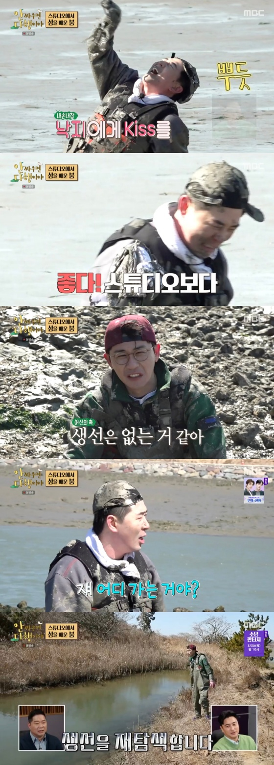 이날 붐은 갯벌에서 낙지를 잡고 "이 맛이야"라며 환호했다. 이어 "스튜디오보다 좋다"라고 소리쳐 웃음을 자아냈다. 붐은 영탁, 송진우와 생선을 얻기 위해 자리를 이동했다. 영탁은 얕은 수심에 "고기가 있을 것 같지 않은데?"라며 자리를 옮겼다. 영탁은 깊은 웅덩이를 발견하고 "오히려 이런 데가 있겠고만"라며 기대했다. 영탁은 붐과 송진우를 자신이 있는 쪽으로 불러 그물로 고기를 잡았다.