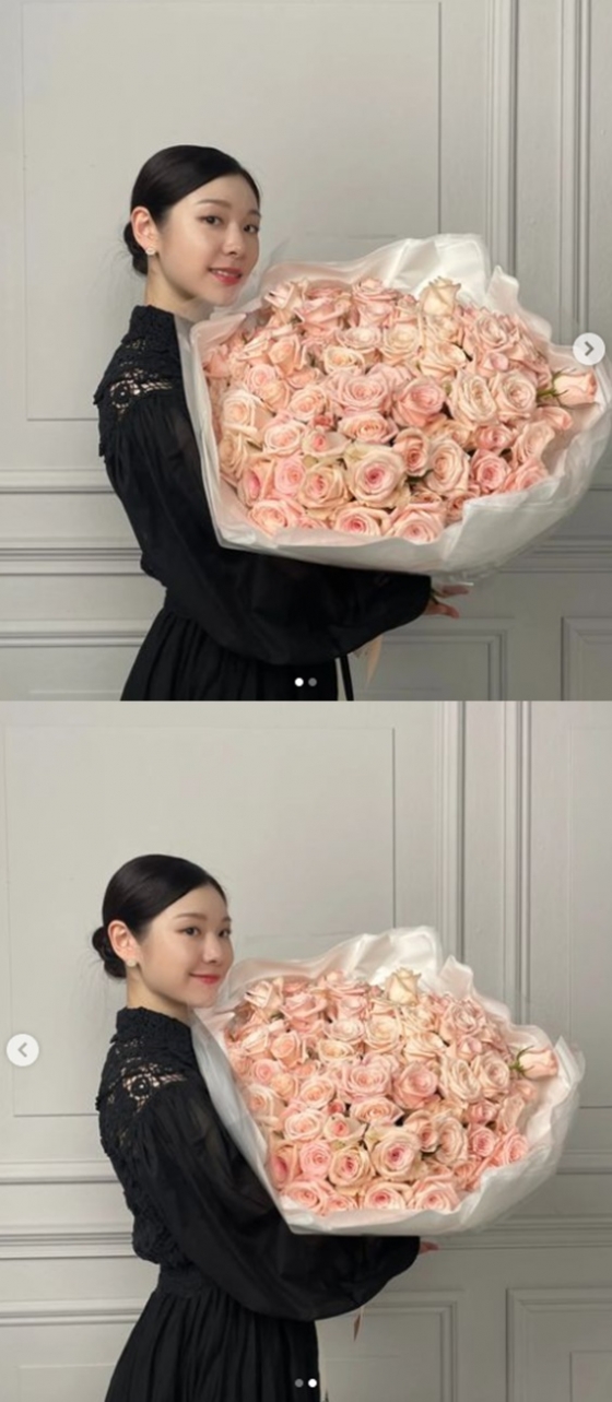 김연아는 27일 핑크빛 장미꽃을 안 아름 안고 찍은 사진을 게재했다.