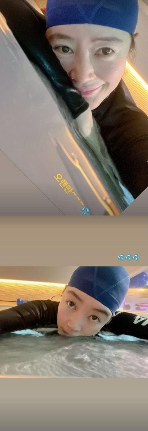 사진 속 김혜수는 수영장에서 운동을 하고 있는 모습이다. 그는 래시가드를 입고 머리에는 수영모를 쓰고 있다.