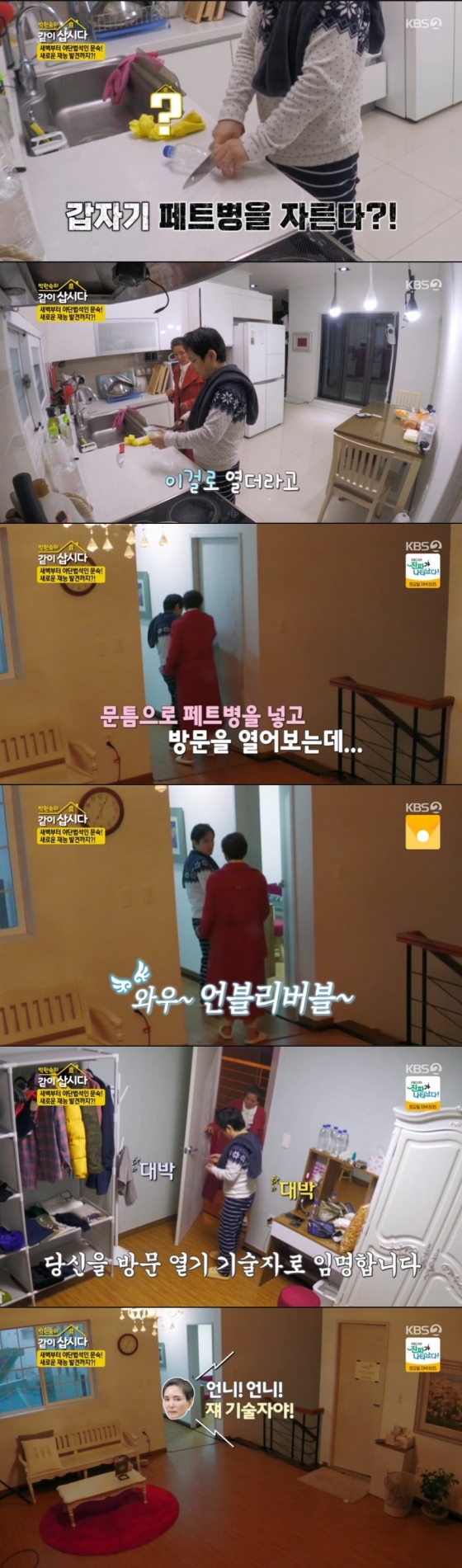 28일 오후 방송된 KBS 2TV '박원숙의 같이 삽시다 시즌3'에서 안문숙이 페트병을 활용해 잠긴 문을 여는 데 성공했다.