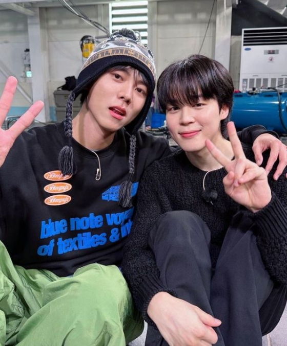공개된 사진에는 주우재와 지민이 사이 좋게 앉아 포즈를 취하는 모습이 담겨 있다. 두 사람은 손가락 브이(V)를 그리며 화기애애한 분위기를 자아냈다.