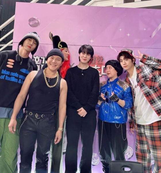 또 다른 사진 속 지민은 KBS 2TV 예능 프로그램 '홍김동전' 출연진들에 둘러싸인 채 웃고 있다. 훈훈한 분위기가 감탄을 불러일으킨다.