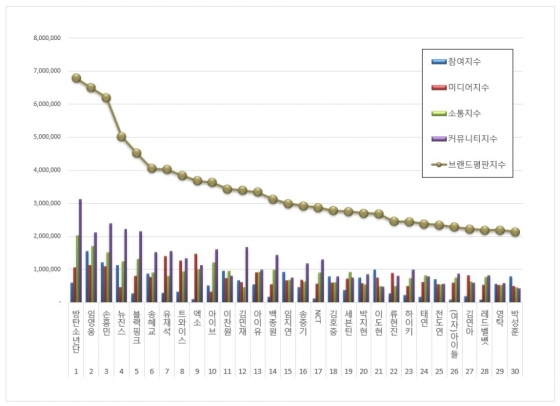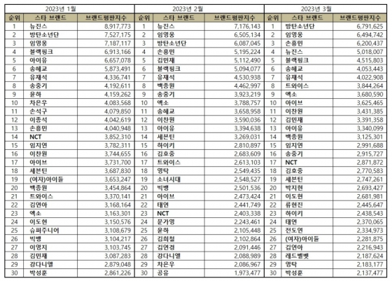 2023년 3월 스타 브랜드평판 30위 순위는 방탄소년단, 임영웅, 손흥민, 뉴진스, 블랙핑크, 송혜교 , 유재석, 트와이스, 엑소, 아이브, 이찬원, 김민재, 아이유, 백종원, 임지연 , 송중기, NCT, 김호중, 세븐틴, 박지현, 이도현 , 류현진, 하이키, 태연, 전도연, (여자)아이들, 김연아, 레드벨벳, 영탁, 박성훈 순으로 분석됐다.