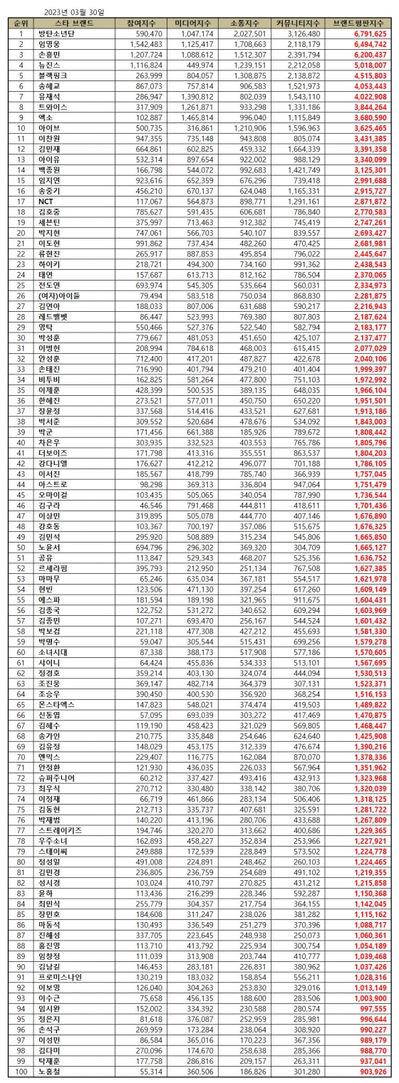 스타 브랜드평판 2023년 3월 빅데이터 분석 100위는 방탄소년단, 임영웅, 손흥민, 뉴진스, 블랙핑크, 송혜교 , 유재석, 트와이스, 엑소, 아이브, 이찬원, 김민재, 아이유, 백종원, 임지연 , 송중기, NCT, 김호중, 세븐틴, 박지현, 이도현 , 류현진, 하이키, 태연, 전도연, (여자)아이들, 김연아, 레드벨벳, 영탁, 박성훈 , 이병헌, 안성훈, 손태진, 비투비, 이제훈, 한혜진, 장윤정, 박서준, 박군, 차은우, 더보이즈, 강다니엘, 이서진, 아스트로, 오마이걸, 김구라, 이상민, 강호동, 김민석, 노윤서, 공유, 르세라핌, 마마무, 현빈, 에스파, 김종국, 김종민, 박보검, 박명수, 소녀시대, 샤이니, 정경호, 조진웅, 조승우, 몬스타엑스, 신동엽, 김혜수, 송가인, 김유정 , 엔믹스, 안정환, 슈퍼주니어, 최우식, 이정재, 김동현, 박재범, 스트레이키즈, 우주소녀, 스테이씨, 정성일, 김민경, 성시경, 윤하, 최민식, 장민호, 마동석, 진해성, 홍진영, 임창정, 김남길, 프로미스나인, 이보영, 이수근, 임시완, 정은지, 손석구, 이성민, 김다미, 탁재훈, 노홍철 순으로 분석됐다.