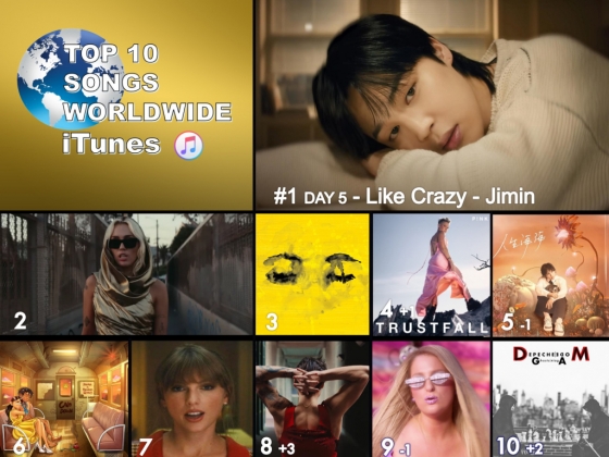 'Like Crazy'는 발매 7시간 10분 만에 100개 국가/지역에서 1위를 점령, 24시간 동안 112개국 1위를 차지하며 최다 기록을 세운 가운데 'Set Me Free Pt.2'가 111개국으로 2위, 107개국의 OST 'With You'(위드 유)가 3위로 완전한 지민의 독무대다.