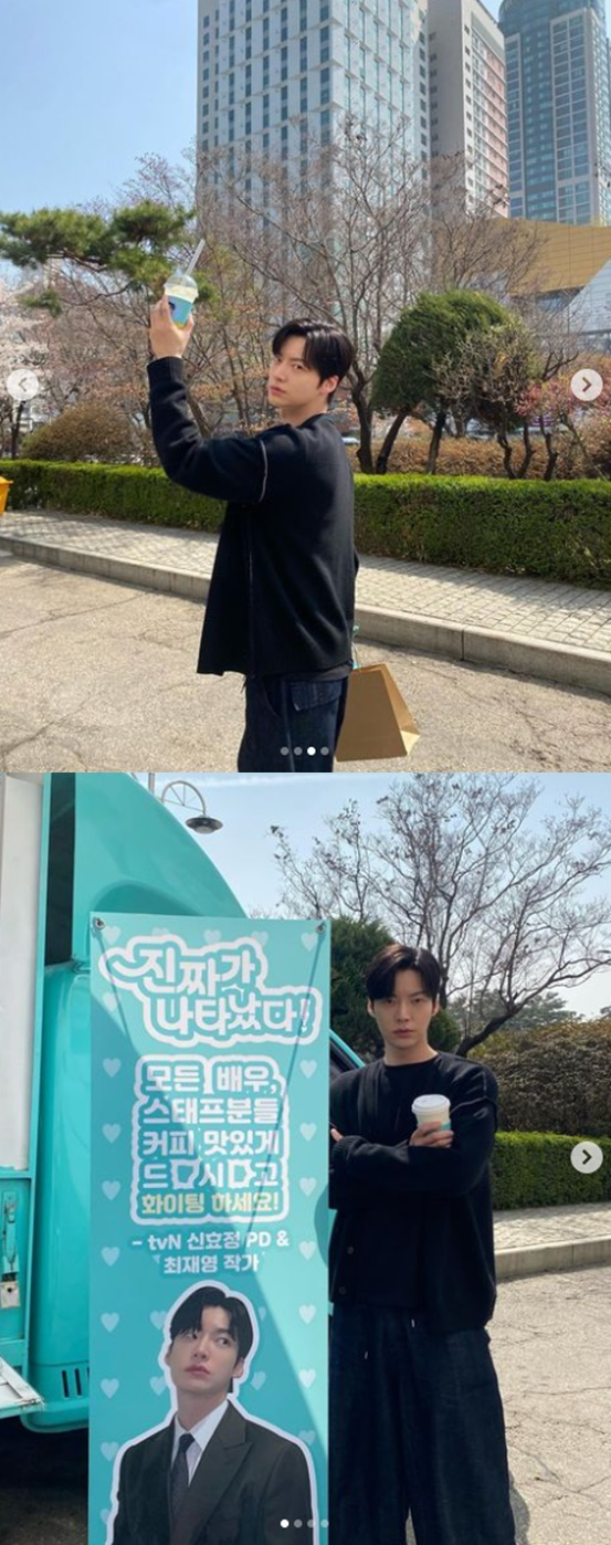 안재현은 30일 KBS2TV 드라마 '진짜가 나타났다' 촬영장에 선물 받은 커피차 앞에서 찍은 사진을 게재했다.