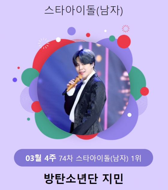 지민은 지난 3월 23일 오후 3시 1분부터 3월 30일 오후 3시까지 진행된 3월 4주(74차) 스타랭킹 스타아이돌 남자 랭킹 투표에서 2만 6435표를 받아 1위를 차지했다. 이로써 지민은 74주 연속 1위를 유지하고 있다.