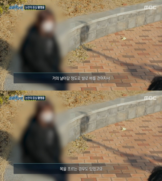 이날 황영웅의 전 여자친구 A씨는 '실화탐사대' 제작진을 만나 데이트 폭력을 당했던 순간을 회상했다. A씨는 "황영웅과 연관되어 이야기들이 많이 나와서 연락이 많이 았다. 스트레스도 많이 받았다. 주위 사람들이 황영웅이 나한테 잘못했다는 건 진짜 모두 인정하는 사실이다"라고 밝혔다.