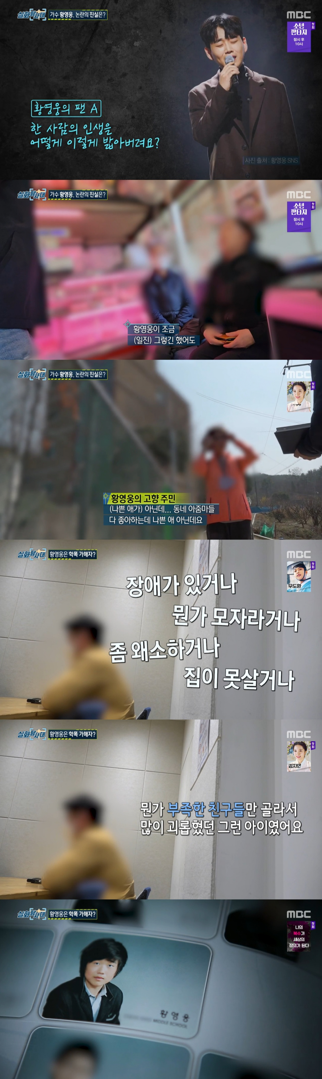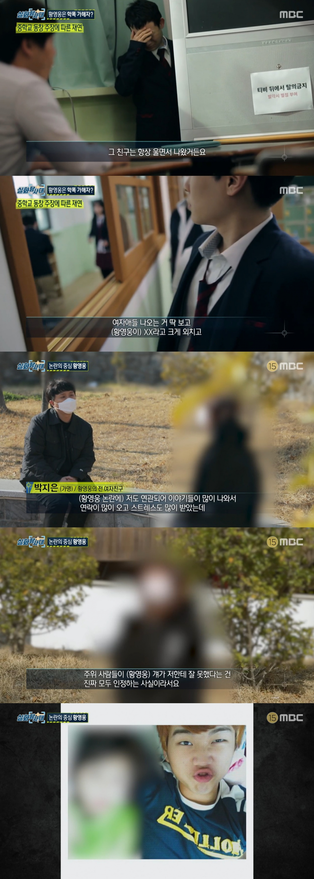 반면 황영웅 중학교 동창들은 이야기가 사뭇 달랐다. 황영웅 동창은 "장애가 있거나 모자라거나 왜소하거나 집이 못살거나 부족한 친구들만 골라서 많이 괴롭혔다"면서 황영웅의 중학교 졸업 앨범을 직접 보여줬다. 황영웅은 키가 183cm로 학창시절 체격이 꽤 좋았다고.