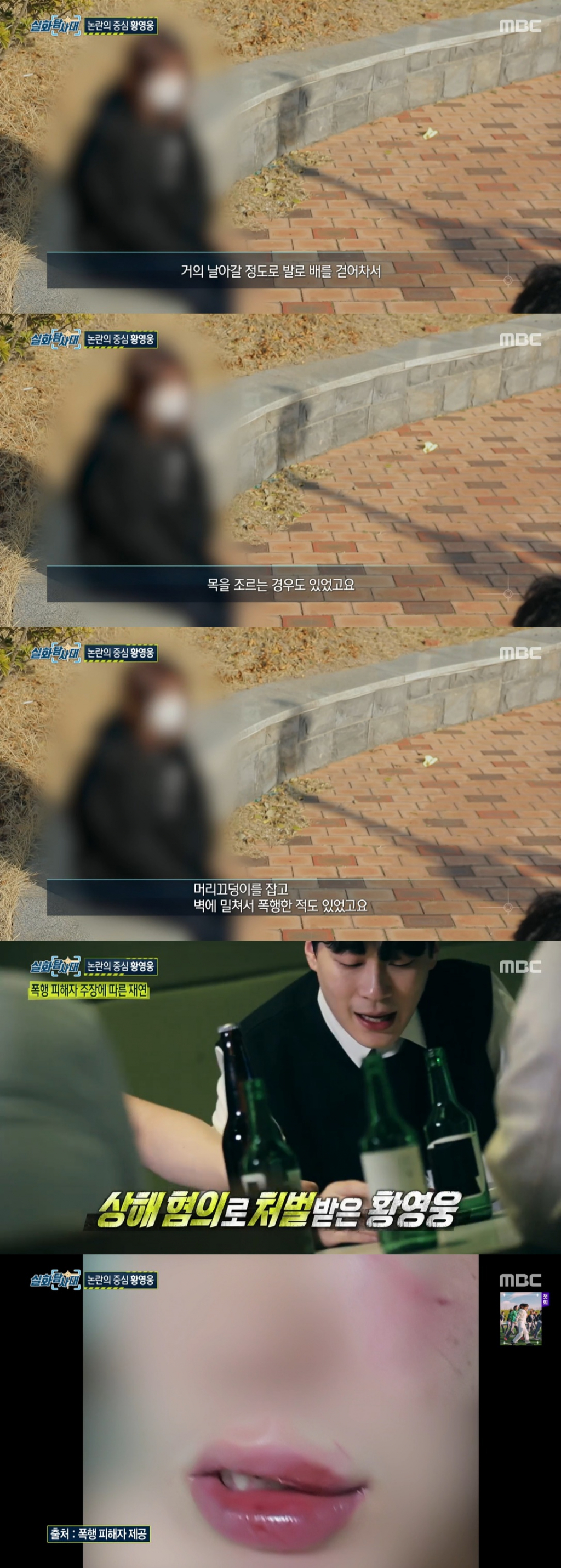 '실화탐사대' 는 어린 시절 황영웅에게 폭행 당한 친구와도 인터뷰를 진행했다. 그는 "황영웅과 술을 마셨는데 갑자기 주먹이 날아왔다. 얼굴을 맞고 쓰러졌는데 또 발로 얼굴을 차더라"고 주장했다.