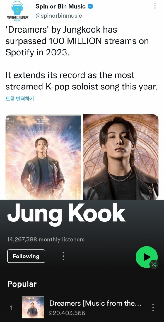 아시아 음악 매체 'Spin or Bin Music'은 공식 계정을 통해 "정국의 'Dreamers'가 2023년 스포티파이에서 1억 스트리밍을 돌파했다"며 "'Dreamers'는 K팝 솔로 가수곡 중 올해 가장 많이 스트리밍 되는 기록을 경신했다"고 전했다.