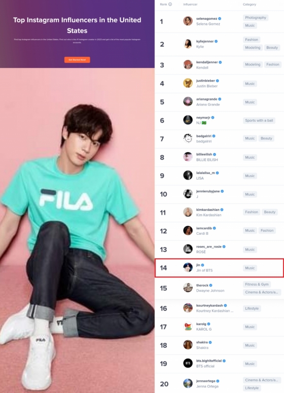 방탄소년단 멤버 중 '미국에서 가장 영향력 있는 인플루언서' TOP 50에 랭크인한 유일한 멤버인 진은 세계 최유명 아티스트이자 셀럽인 카디비(Cardi B), 더 락(The Rock, 드웨인 존슨), 샤키라(Shakira) 등과 함께 최강의 인기를 자랑했다. 방탄소년단의 소속사인 빅히트 공식 계정은 19위에 랭크되어 눈길을 끈다.