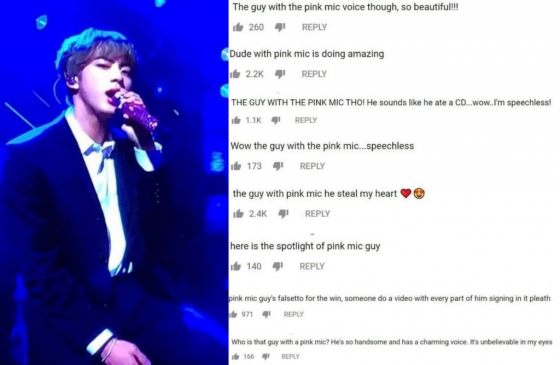 비현실적일 정도로 잘생긴 외모로 전 세계 남녀노소에게 궁금증을 일게 만드는 진은 보컬 또한 완벽하기로 유명해 '핑크마이크 가이'로 미국 등 전 세계 대중들의 마음을 사로잡았다. 수많은 일화 중 하나로 방탄소년단은 2019년 미국 CBS의 '레이트 쇼 위드 스티븐 콜베어'(The Late Show with Stephen Colbert, 이하 레이트 쇼)에서 'Make It Right' 공연을 선보인 바 있다.