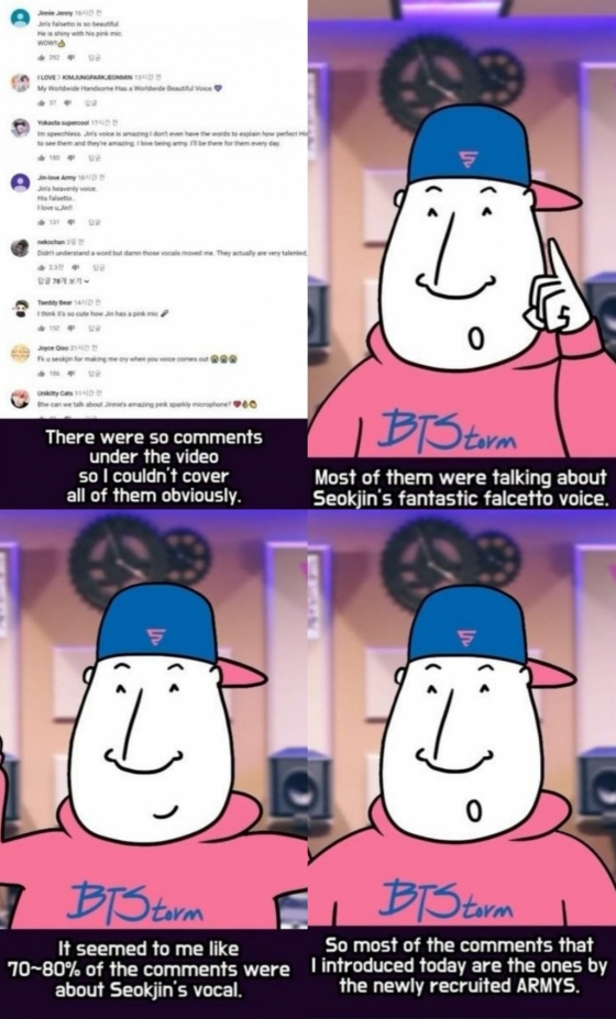 유튜버 바이스톰(BySTorm)에 의하면 외모와 목소리가 천사 같다며 핑크 마이크를 든 진을 향한 레이트 쇼 시청자들의 찬사가 해당 라이브 영상 댓글의 대부분을 차지했다. 바이스톰은 댓글들이 수만개라 다 소개할 순 없지만 진의 환상적인 보컬에 대한 언급이 70~80퍼센트는 되는 것 같다며 기존 방탄팬보다 새로 방탄팬이 된 사람들의 댓글 위주로 소개해줬다고 설명했다.